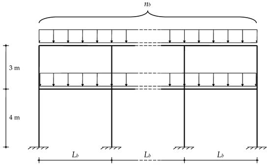 In this work, this old simplified procedure was used to design some reinforced concrete frames (Figure 5) in order to simulate the design solutions usually adopted in Portugal in that period (using the minimum number of rebars that leads to As ≥ 0.005⋅bc⋅hc), which were used as the training set of a MFFNN. The adopted input variables were the number of beam spans (I1 = nb), the mean beam span dimension (I2 = Lb) and the mean cross-section column height (I3 = hc).