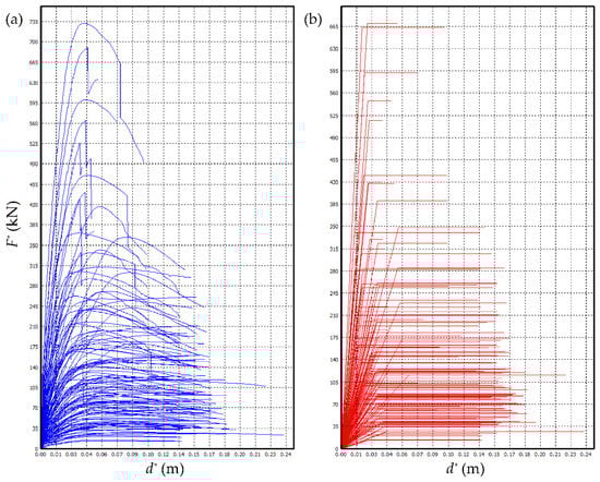 The capacity curves were obtained by using the SeismoStruct software [] and adopting a triangular force pattern. In Figure 6a all the 125 original capacity curves of the single degree of freedom system are presented and the corresponding simplified equivalent elastic-perfectly plastic capacity curves are presented in Figure 6b.
