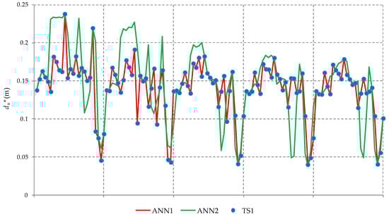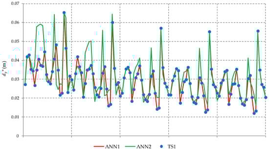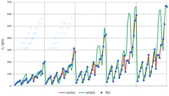 The results obtained with the two neural networks (ANN1 and ANN2) are compared in Figure 8, Figure 9 and Figure 10. The blue dots are the results obtained from the 125 nonlinear structural analysis (TS1) and the red and green lines are the corresponding results obtained with ANN1 and ANN2, respectively.