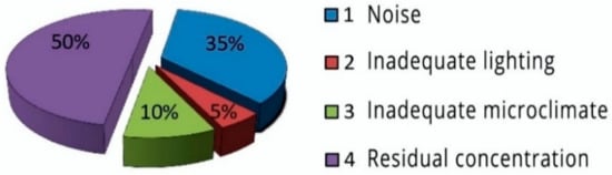 As can be seen in Figure 1, experimental researches [] show that within an office a worker can have a reduction of concentration up to 50% with very high consequences from the point of view of production. Moreover, the subjective sensitivity of the workers is important for the changing of the acoustic and environmental conditions [].