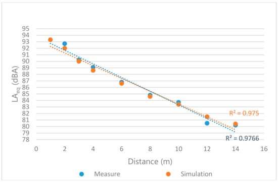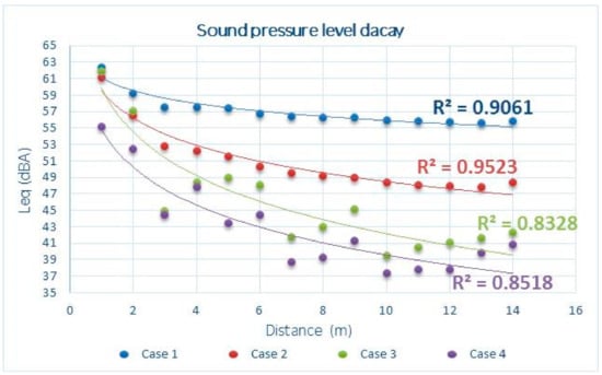 This phenomenon is caused by the diffraction effect of the sound that determines a decrease of the sound level immediately after the high partition and the screens in the workstations, while in the successive points, this effect is reduced and the sound pressure level increases again, according to the room’s acoustic quality. The diffraction effect determines great data dispersion, and consequently, a lower correlation coefficient.