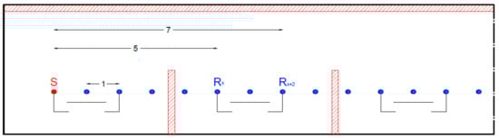 This latter problem is particularly strong in case 3, where the sound spatial decay in the box (the portion of the office between two opposite separating screens), called D2,S(box), shows negative values for all kinds of offices except office A (Table 6). This is due to the fact that the sound decay within the box has been obtained by arithmetical subtraction and not according to the trend line. As shown in Figure 9 and Figure 10, referred to as an example of office type C, the receivers used to extract D2,S(box) are Rx and Rx+2. The receiver Rx is situated behind the high partition and is little affected by the diffraction effect, and as a consequence, the Sound Pressure Level (SPL) is lower than in Rx+2, even if this last is further from the source. For example, in office type C, in case 3, LAeq in receiver Rx is equal to 43.3 dB(A) while in Rx+2 is equal to 44.6 dB(A), so the D2, S(box) obtained from arithmetical subtraction is a negative value.