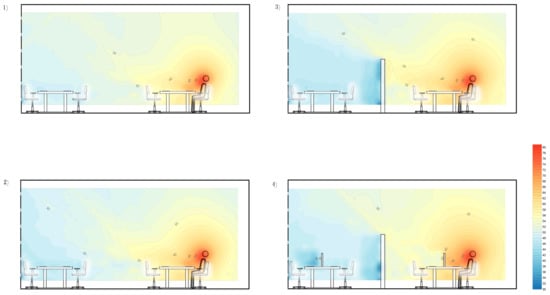 In open plan offices, furthermore, the control of air quality is very difficult because it is necessary to prevent the dispersion and depository of expiratory droplets that are generated locally []. For these reasons, the study on the type of ventilation is fundamental; some researches have investigated the impact of ventilation strategies on particle deposition in a ventilated room [,]. Other researches show that the air curtain system is efficient in removing and preventing dispersion of the expiratory droplets [].