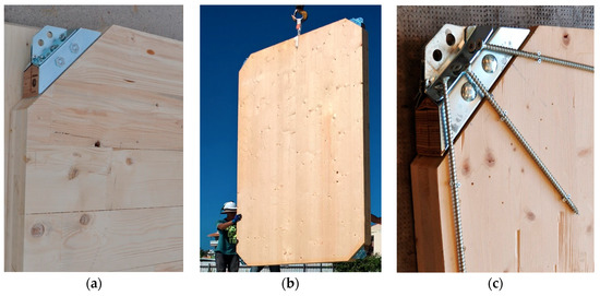 (a) X-Rad connector installed at one corner of a cross-laminated timber (CLT) panel; (b) CLT wall with connectors ready to be installed; (c) mock-up of X-Rad connector with in-view of its different parts (photos courtesy of Rothoblaas).