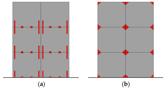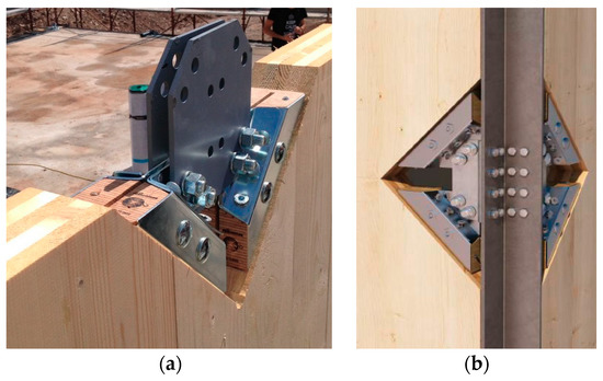 The reference and other systems employ glulam beam-and-column frameworks to resist effects of vertical design loads, as good practice for ensuring existence of well-defined load-paths and avoiding potential for disproportionate damage if substructures are overloaded [8,36]. Within case studies, systems having standard CLT anchoring connections consisting of hold-down ties and angle brackets capable of resisting sliding forces are referred to as type A systems, whereas systems having X-Rad connections are referred to as type B systems. A homogeneous distribution of connections was considered to make SFRS A and B consistent in terms of installed anchoring devices along the height of buildings. Figure 4 shows the connection arrangements for type A and B systems. The logic of type A systems is that, consistent with already-mentioned principles of avoiding ambiguity in how forces flow through SFRS, there is functional separation between flow pathways for vertical and horizontal forces at every junction between parts of SFRS.
