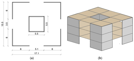 Reference building: (a) building footprint and shear-wall arrangement; (b) axonometric view (dimensions in m).