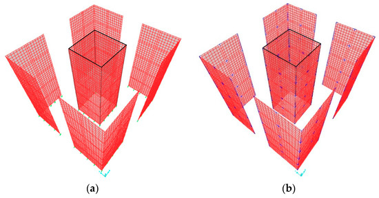 Finite element models were built in SAP 2000® using mechanical properties reported in Section 3.3 adjusted in the case of CLT according to recommendations of Dujic et al. [48]. Linear-elastic discretization was adopted based on shell-element and equivalent-spring representations of CLT and connections respectively, Figure 5 and Figure 6. For type A systems (Figure 5a) springs representing hold-downs and angle brackets were positioned vertically and horizontally, respectively, to ensure uncoupled behaviour, consistent with the intent for force flows through them to be uncoupled [49]. For type B systems, X-Rad connections (Figure 5b) were modeled by two orthogonal uniaxial springs calibrated to represent elastic stiffness in vertical and horizontal directions, consistent with creation of point pinned connections. In the cases of type B systems having five or eight storeys, models contained supplementary tie elements (shown as bold vertical lines in Figure 5b) at edges of shear walls. Supplementary ties were added only when force flows would otherwise exceed capacities of X-Rad connectors. Figure 6 shows three-dimensional FE representations of complete SFRS systems.