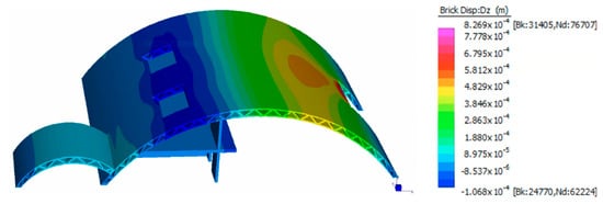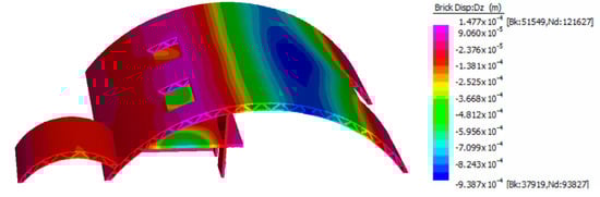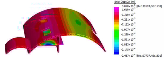 The live load areas are defined as concentrated only in habitable areas (i.e., the floors and first-floor slab), with minimal loadings in inhabitable areas (i.e., the arch roofs). Therefore, the deflection contour due to imposed action shows a different profile when compared with the deflection due to dead load in