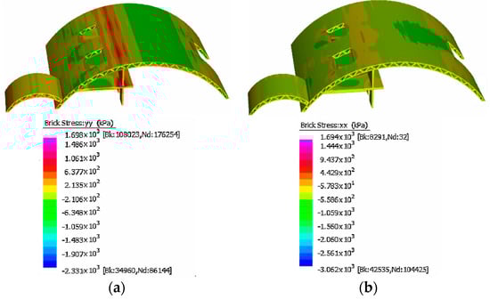 Figure 11b shows the stress in xx directions. Both figures also include the contour for inspecting the load concentration point among the building’s design. As stated previously, the minimal effect of wind loadings arises because low-rise buildings expose a limited surface area, and there is minimal wind speed at a low height. The resulting critical load combination case is, therefore, one without wind loadings, and its influence is minimal.