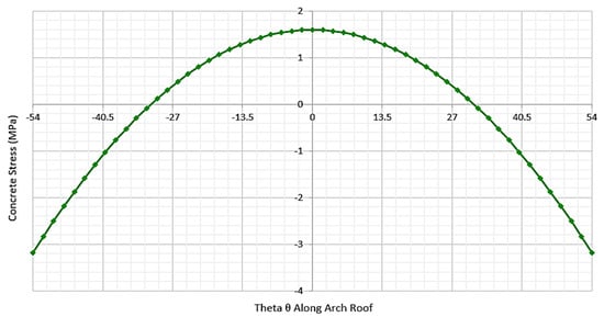 θ. The roof is mostly subjected to compressive stress along the two roof-ends, with the middle subjected to tensile stress. The maximum tensile stress is about 1.6 MPa, which the concrete roof can withstand because the 3D-printed house uses a concrete–rHDPE mixture that has a tensile characteristic of 3.0 MPa. Therefore, the concrete required no reinforcement. This result is consistent with the numerical analysis from Strand 7, where the maximum tensile stress experienced by the arch roof was found to be 1.69 MPa. Note that the referring result arose from a load combination instead of a pure dead load by the roof. However, since this hand calculation assumed a solid roof-slab, rather than a roof full of truss-like voids, the result of the hand calculation should be taken as an overestimate of the bending stress experience by the roof itself (see