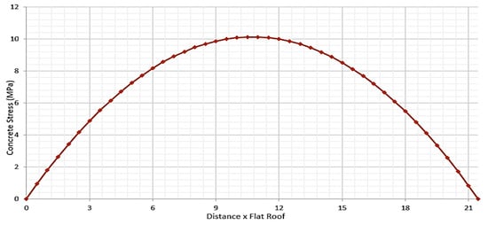 Figure 16. The tensile stress is higher than that of the arch roof. The maximum bending stress that the flat-slab roof can experience is 10 MPa at the middle of the roof. This result was expected since the flat slab would have maximum sagging in the middle, particularly in the absence of any support. The long span of the roof induced an excessive tensile stress that was much greater than the tensile strength of the concrete–rHDPE mixture, which is only 3 MPa. Such high tensile stress in the middle of the flat slab is typically acceptable in traditional reinforced concrete. However, for this 3D-printed house, the excessive tensile stress does not suit the cement mix in the absence of reinforcement. Therefore, a flat-slab roof design is not suitable for 3D-printed housing. The excessive tensile stress would cause the concrete to fail.