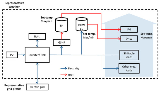The simulated building is the virtual residential nearly-zero energy building implemented in the emulator platform at Aalto University [16]. It has a net floor area of 150 m2 and adheres to the Finnish Building Regulation D3 [17]. The electricity demand profiles for lighting and appliances and the domestic hot water (DHW) demand are based on the D3 regulation and on [18]. Unlike the building in the emulator platform, where heat is supplied through radiators, the building in this study integrates a floor heating (FH) system. The purpose of this modification is to investigate the effect of the building’s heat storage capacity. The floor consists of a 4 cm layer of fiberglass, piping embedded in 10 cm of concrete, and 1 cm of ceramic tiling on the upper surface. Table 1 shows the main building features, and further information about the building and the emulation platform is available in [16,19,20].