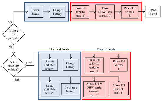 The control strategy consists of the energy management rules designed to enhance energy matching and reduce costs through energy flexibility actions. There are two main sets of rules. The first set aims to maximize the onsite utilization of the energy generated by the PV system, by first covering the electrical loads, then making use of the electric and heat storage capacities and finally exporting any surplus that may remain. The second set aims to minimize the cost of covering the energy demand in the building. To do so, the rules are defined to supply energy to the electricity and heat storage components when the prices are low, and discharge the storage components when the prices are high. The rules also promote the operation of shiftable machine loads when prices are low. Figure 2 illustrates the energy management rules, including the utilization order of the PV output and the price-based management actions.