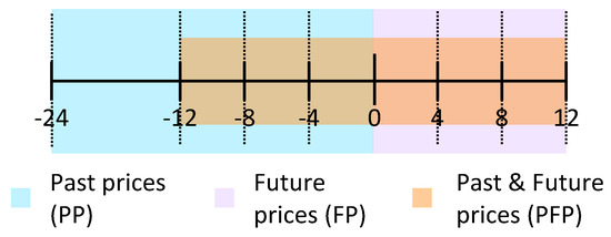 The control strategy is composed of two parts: the definition of price thresholds and the energy management rules. To make decisions that depend on electricity prices, it is necessary to define what “low” and “high” prices are. In this study, the low and high thresholds for electricity prices are calculated based on three criteria: the location of the time window with respect to the current time step; its length; and whether percentiles or moving averages are calculated. The time window can be based on past prices (PP), on future prices (FP), or on both past and future prices (PFP). The length of the time window can be 4, 8, and 12 h for FP and PFP, and 4, 8, 12, and 24 h for PP. Day-ahead HEP are published every day at 12:42 by NordPool [22], therefore 24 h cannot be included in FP or PFP because in the hours between 01:00 and until day-ahead prices are published, not all the required hourly price data is available. For instance, on 1 December at 11:00, the HEP until midnight are known but not beyond that time; only at 12:42 will the HEP for 2 December be available. For PP, the shiftable machine loads (see Section 2.4.) are operated when prices are below the low-price threshold; if this does not happen within the operation window, the shiftable machine loads are operated in the last possible time-step. For FP and PFP, the shiftable machine loads are operated at the time-step with the lowest price within the operation window. The different strategy is needed because for PP it is assumed that the system does not know the upcoming prices, and therefore cannot know if lower or higher prices are coming. Figure 3 shows a graphic representation of PP, FP, and PFP, and the time windows. Finally, the thresholds are calculated with the bottom (10, 20, 30, and 40) and upper (60, 70, 80, and 90) percentiles of the HEP time window, or as deviations from the moving average based on the HEP time window: −1, −2, or −3 €cent for the low threshold and +1, +2, or +3 €cent for the high threshold. All the threshold combinations are investigated (i.e., asymmetrical combinations are included), with a total of 250 different cases. The parameters in the RBC have been defined based on preliminary analysis of energy system, and on the context of the study, with the aim to present a reasonably wide array of the results.