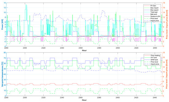 The operation of the RBC is shown in Figure 4 for hours 2280–2448, which correspond to the week from April 6–13. The operation corresponds to the case leading to the lowest operational energy cost (see Table 5). This week has been chosen as it includes significant floor heating demand and onsite generation. A notable characteristic of the operation is that the price level (i.e., whether the price is considered as low, normal or high) can go from low to high and vice-versa with price changes of fractions of a cent (such as between the hours 2280 and 2300), which is due to the percentile approach. The onsite generation is utilized to cover the electrical loads and to charge the battery, yet the surplus is not enough to activate any further actions by the RBC. The price-based management is more active: the battery charging and discharging, as well as the modulation of FH, FH tank, and DHW tank set-point temperatures can be seen throughout the week. Also, examples of the shiftable machine loads can be seen in hours 2354 and 2374, when low prices were available. Instances such as in hour 2357, when the clothes dryer is used at high prices, indicate that the load was shifted to the hour with lowest HEP within the operation time window, as described in Section 2.4.