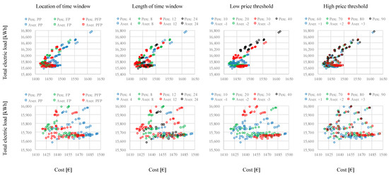 The results for the different criteria for price categorization by the RBC, as described in Section 2.3., are shown in Figure 5. The first column shows the results according to the location of the time window (i.e., PP, FP, and PFP); the second column shows the results according to the length of the time window (i.e., 4, 8, 12, or 24 h); the third column shows the results according to the threshold for low price classification, and the fourth column shows the results according to the threshold for high price classification. The top row shows the full set of results, while the bottom row zooms into the results with low cost and load. Using percentiles can lead to the most cost-attractive results (below €1425) yet also to the least attractive ones (up to above €1600), while the results when using averages stay within a narrow range (€1427 to roughly €1500), mostly with lower cost than the reference case. The location of the time window and its length show other defined behaviors. In the first column of Figure 5, the results indicate that price thresholds with PP and 4-h windows lead to the highest costs and loads, and in most cases lead to higher costs and loads than price thresholds with FP and PFP with 8 or 12-h windows. The graphs in the first and second columns thus show two defined behaviors: percentiles with PP can lead to the highest costs and loads (above €1550), and percentiles with 12-h windows can lead to the lowest costs and loads (below €1425).