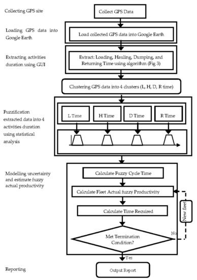 - Performing statistical analysis on the extracted durations includes calculating minimum, maximum, mean, and median of loading, dumping, hauling, and returning time of the tracked truck to form fuzzy numbers of the cycle time.