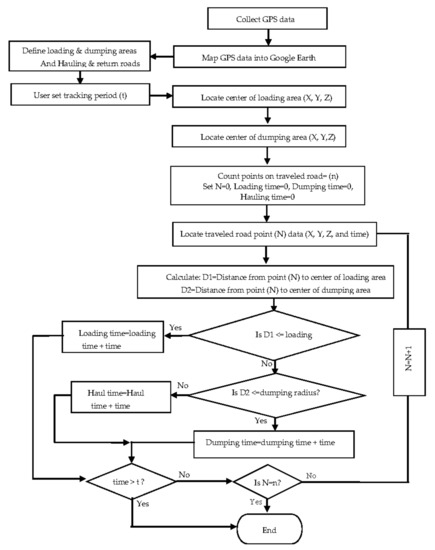 - Having defined the loading and dumping sites, the developed algorithm of extracting duration then extracts the coordination (XYZ) of positions on the traveled road from GPS data.