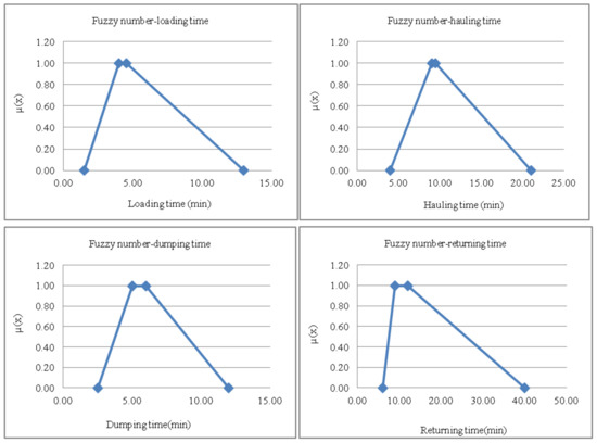 Trapezoidal and triangular membership functions were used to define the uncertainties associated with activity durations; respectively. In first case, activity durations (loading, hailing, dumping, and returning) were defined by trapezoidal fuzzy numbers. In the second case, activity durations were defined by triangular fuzzy numbers with their full membership at the median.