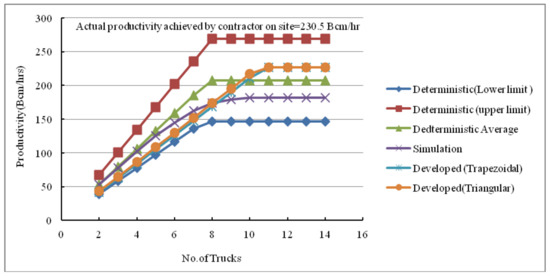 The number of trucks involved in the operations was varied and therefore the associated productivity was estimated to enable a comparison over a wide range of trucks used in Montaser et al. [7]. In addition, ambiguity, possibility, fuzziness measures, agreement index, and expected value are all used to assist in defining the uncertainty associated with the estimated productivity. Comparison of the outputs of the developed methodology to the actual productivity the contractor achieved and to those obtained by simulation-based model [15,19] is shown in Figure 5.