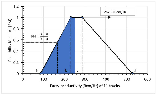 The assessment of feasibility of productivity to be at a set crisp value or within a specific range is also carried out through the possibility measure. As shown in Figure 6, the calculated fuzzy productivity of the fleet that consists of one excavator and 11 trucks (most productive fleet formation) is (a = 86.00, b = 231.24, c = 287.36, d = 528.50) Bcm/hr. The possibility of the following two events are also examined: