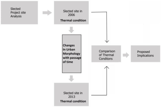 First, an urban site undergoing morphological transformation was selected as the study area. The 2006 morphology of the site was selected for microclimatic analysis. To identify morphological changes, Google Earth images of the study site atdifferent periods were retrieved. The morphological transformations from 2006 to 2013 were considered. ENVI-met software was used to assess and compare the thermo-climatic impacts of the morphological changes of the study site under the same climatic conditions. The simulations for Tair evaluation under previous and present conditions were obtained on 30 July using ENVI-met (Leonardo) results. Finally, the proposed green strategies for the 2013 building typology were used to determine the thermal difference and microclimatic impacts contributed by existing concrete roofs. The effects on the amelioration of Tair at the same day and time by the proposed strategies were also simulated. The study included the following steps, as shown in Figure 2.