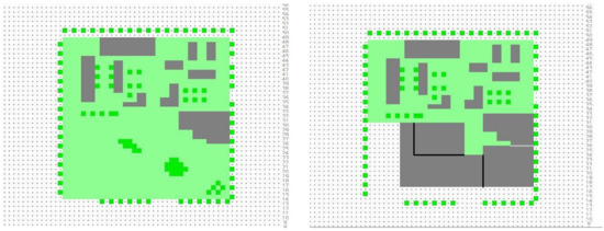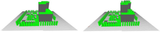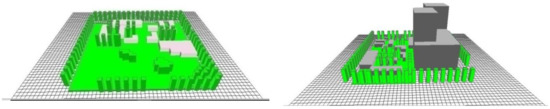 The investigated area was modeled using images retrieved from Google Earth. The model was designed to obtain a reliable visual representation of the dimensions of buildings and streets in the study area. Some limitations and simplifications were imposed on the model design and input data to reduce the number of required simulations. The two-dimensional (2D) layouts of the 2006 and 2013 morphologies were generated by ENVI-met for the comparison of potential Tair differences (Figure 5). The 2006 morphology was compared with the 2013 morphology to determine the increase in Tair that resulted from the construction of new buildings. Two pairs of models were used in this particular project. The first (2006 and 2013 morphologies) models the reconstruction of the selected area in Wuhan, and the second (grass and tree roof morphologies) analyzes the area under two types of green roof environmental design parameters.