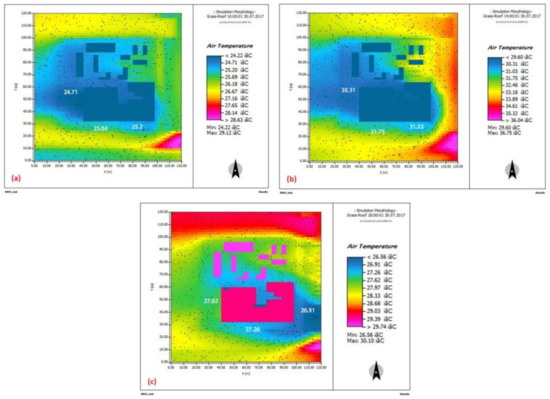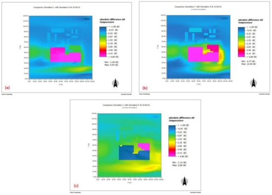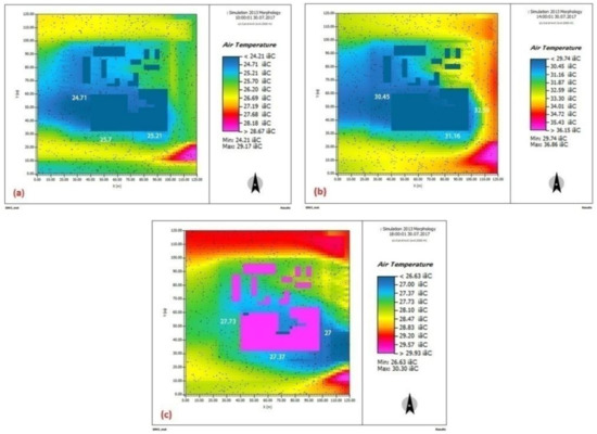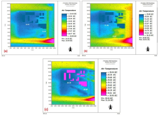 ENVI-met simulation outputs for Tair at (a) 10:00; (b) 14:00; and (c) 18:00.