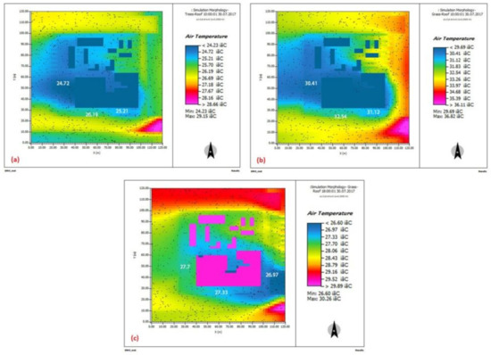 In the third scenario (2013 grass-planted roof morphology), the overall minimum Tair was 24.2 °C in the morning and the maximum was 36.7 °C in the afternoon.