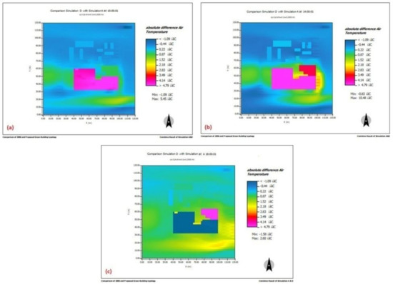 In the evening (Figure 14c), the maximum Tair difference was observed in the east and south and was attributed to the duration of sun exposure and solar orientation. The minimum difference was observed in the north and west.