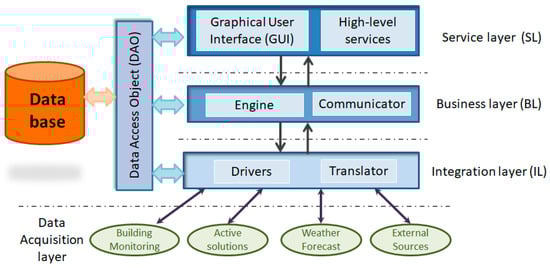The integration layer (IL) has an objective to connect the disparate data sources, merge the information when needed (e.g., periodic data gathering and storage once in the database), and ultimately harmonize data samples into the same format. The business layer (BL) is dedicated to the main activities of the BEMS, i.e., communication between modules, accessing the database, and providing data to the high-level services, among others. Basically, it includes some intelligence in terms of communication; it knows the modular deployment schema and, therefore, how to optimally exchange modular information.