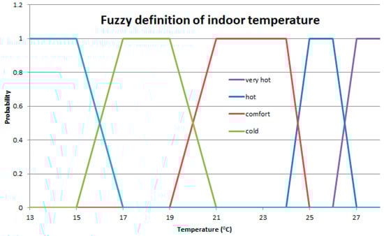 14], and comfort is considered between 21 °C and 24 °C (21–23 °C in winter and 22–25 °C in summer). Moreover, taking into account the building occupants and BEMS end-users’ experience, the uncertainty groups are classified with lower temperatures where the human feeling varies more than with higher temperatures. These uncertainty groups are pivotal at the time of deciding the probability of the situations (i.e., comfort, cold, hot…). This fuzzification process is rendered for each one of the input variables of the system because they need to be interpreted under the probabilities problem [
