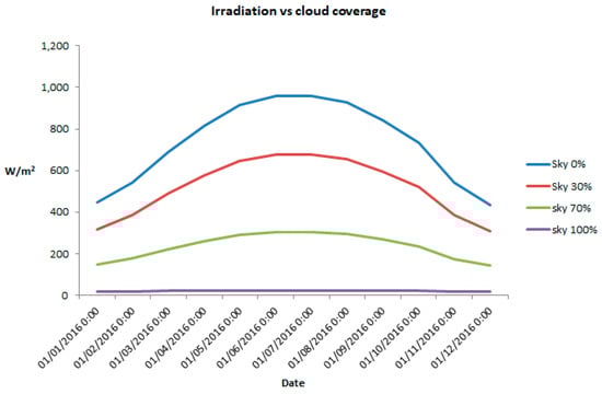 Figure 4 where the solar radiation estimation for the full year is illustrated at the first day of each month and at noon. Additionally, different sky cover percentages are used. The results clearly show how, even in the summer, when the sky is covered, the main contribution of the solar radiation is diffused (low values) and, for lower sky cover values, the trend is similar to the Gauss bell, which is the expected behavior.