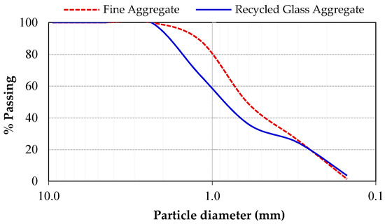 The potential effects of utilizing glass aggregates in concrete reported by previous research [4,28,29,30], were an alkali–silica reaction (ASR) between the amorphous silicate glass grains and alkali of cement in the presence of water that might results in volumetric expansion and spalling. However, experimental evidence proved that the potential problem of ASR decreased with reduced glass aggregate particle size. Du and Tan [31], revealed that glass aggregate less than 2.36 mm would effectively mitigated ASR expansion and assured pozzolanic activity.