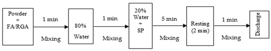 The constituent materials were weighed properly, based on the mix design. The powder, fine aggregate or/and recycled glass were first placed in a mortar mixer, and mixed thoroughly in dry state. After mixing for 1 min, 80% of the required water added to the mixer and continue mixing for 1 min more under normal speed of the mixer. Then the required superplasticiser and 20% of remaining water were introduced and the mixing continued further for 5 min. For dispersibility between superplasticiser and the matrix, the mix was kept resting for 2 min. Finally, the mixture mixed for 1 min before being discharged. The mixing procedure followed in this experimental program is shown in Figure 3.