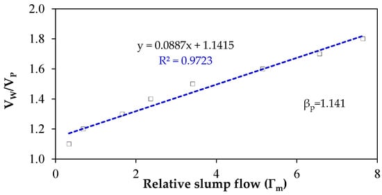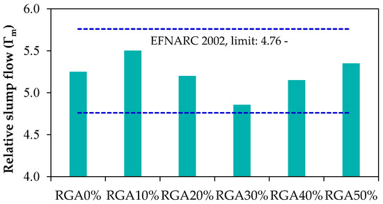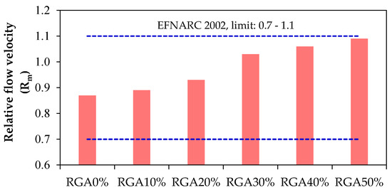 Figure 6 presents the relative flow velocity of all mixes prepared in this study. The flow time of all SCM mixtures was in ranges of 8.7–10.9 s. Incorporation of RGA slightly slows down the flow time of SCM mixtures due to the geometrical shape of glass particles that hinders the movement of the paste matrix. It was observed that the flow time of SCM mixtures was affected by water to powder ratio [11,42]. To reduce the amount of cement, limestone powder was introduced in all mixtures as filler that constitutes 20% of powder volume. Limestone powder increases packing density of particles, lowers void ratio and improves durability [43]. Furthermore, it lowers setting time and improves fluidity [44]. In this experimental study, the first charge of water to powder volume ratio (VW/VP) was considered the same value of βp (retained water ratio) based on recommendation of the Japanese mix design method. The value of retained water ratio (βp = 1.14) was obtained from the paste flow test given in Figure 7. However, after several trial mixes the suitable water to powder volume ratio (VW/VP) was fixed at 1.02 (equivalent to water to powder weight ratio, W/P = 0.33) for all mixtures. The flow time of the reference mixture and SCM containing 50% of waste glass content was 8.7 and 10.9 s respectively. As illustrated in Figure 8, it was observed that utilization of recycled glass aggregates increased the flow time of fresh SCM-RGA mixtures. This was attributed to higher internal friction and high surface tension of glass particles [45]. Keeping water to cement ratio constant, as the content of glass aggregates increased excess water in the mixes increased due to the fact that water absorption of glass is lower than that of fine aggregate and this phenomenon could result in bleeding and segregation of the matrix [3]. In this study, it was visually observed during execution of slump flow test that the slump flow spread of all mixes was very consistent and stable (see Figure 9).