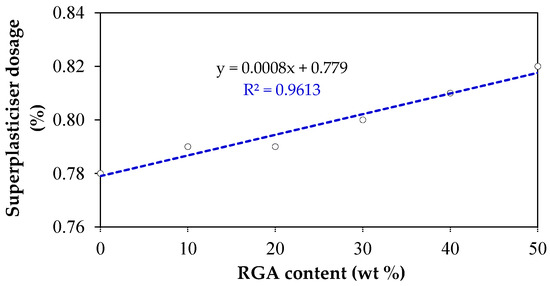The SCM mixtures were designed to deform 250 ± 10 mm conforming to EFNARC [8] criteria, which was achieved by adjusting the dosage of superplasticiser (SP). The relative slump flow of SCM-RGA mixes is given in Figure 4, and as it can be seen, the values of relative slump of all mixes are in the reference range. The experimental test results showed that as the content of RGA increased, the slump flow slightly decreased. This finding is consistent with the research outcomes, Limbachiya [18] reported reduction in slump flow as washed glass sand (WGS) percentage exceeded 30%. A research conducted by Ismail and AL-Hashmi [17] reported similar results that as the content of recycled glass increased, slump flow decreased. Similar observations were also reported by Afshinnia and Rangaraju [16]. The grain shape (sharp and angular edge) and higher aspect ratio of RGA attributed to the slight reduction of flowability of SCM mixtures [19]. Consequently, Figure 5 clearly indicates that to maintain the slump flow of mixtures containing glass aggregate within the range of 250 ± 10 mm, superplasticiser dosage was increased as the content of RGA increased (R2 = 0.96). The use of superplasticiser (SP) ensures deflocculating and reduces water demand of SCM mixtures and intensify intermolecular interaction of particles [40]. The dosage of superplasticiser for each mixture was determined based on the slump flow test to obtain desired flowability that met self-compactability requirements [41]. The dosage of superplasticiser of all mixes was between 0.78% and 0.82% by weight of powder.