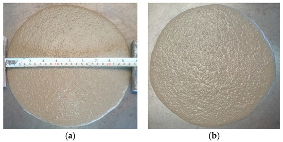 Typical slump flow of SCM-RGA0% and SCM-RGA50%; (a) SCM-RGA0%; (b) SCM-RGA50%.