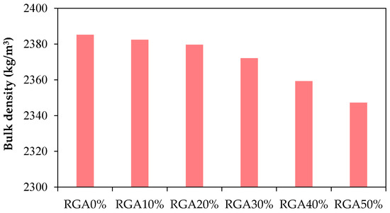 The hardened bulk density of all SCM-RGA specimens prepared in this study measured at 28 days are tabulated and graphically presented in Figure 10. Specimens containing RGA exhibits relatively lower hardened density when compared to specimens with natural fine aggregate. This reduction in density could be due to the fact that particle density of RGA used in this research were 1.3% lower than that of natural fine aggregate [17,19,24,25,46]. The density for all specimens were in the range of 2347 kg/m3 to 2386 kg/m3. Moreover, the hardened specimens incorporating 50% RGA showed 1.6% reduction of bulk density relative to that of the reference specimens.
