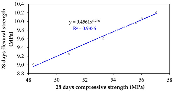 Figure 13 presents the evolution of flexural strength at 3, 7, 14 and 28 days and experimental results show a trend that resembles the compressive strength results. However, the influence of RGA was not as pronounced on flexural strength as seen for compressive strength. According to experimental results, 28 days flexural strength tends to decrease by 1.38%, 2.52%, 5.97%, 9.40% and 11.70% for RGA content of 10%, 20%, 30%, 40% and 50% respectively. The results obtained in this research are consistent with other authors [19,23,25,47] who reported that the flexural strength of mixes containing RGA decreased with respect to increases in replacement level. The average of three measurements plotted in Figure 14 indicates a correlation between RGA replacement level and 28 days of flexural strength with high reliability (R2 ≈ 0.99). Moreover, as shown graphically in Figure 15, the relationship between the 28 days compressive and flexural strength for SCM mixes incorporating RGA showed strong correlation in a power regression function (R2 = 0.99). It is evident that as compressive strength of SCM-RGA mixes increased, flexural strength also increased. Limbachiya [18], reported a similar trend with a correlation factor of (R2 = 0.92) for washed glass sand mixes.
