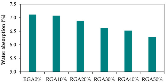 The water absorption by immersion test results of all SCM-RGA mixes are given graphically in Figure 16. It is found that inclusion of RGA slightly decreased water absorption. This reduction was due to the fact that glass does not absorb water. This result is in line with other authors [26,48,49]. The maximum water absorption obtained after 72 ± 2 h immersion was 7.11% for the control mix and the lowest was 6.29%, belonging to a mix with 50% RGA content. It is generally believed that good quality concrete has water absorption of less than 10% [50]. All the SCM mixes produced in this research met the requirements and can be regard as a good quality concrete.