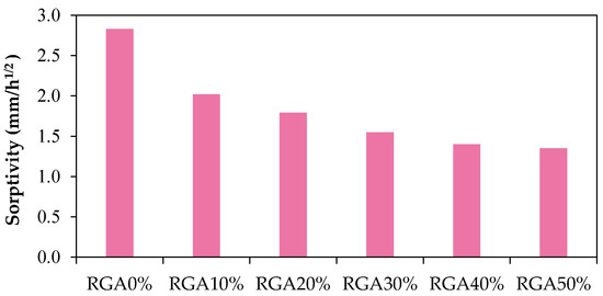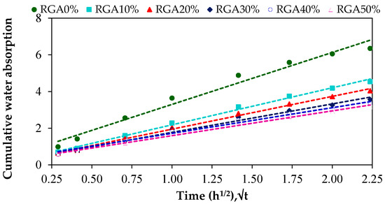 When the surface of hardened concrete is submerged in water or exposed to moisture, the concrete pores absorb water by action of capillary suction and the rate at which water is absorbed is called sorptivity. Durability, deterioration under wet-dry cycle and service life time of concrete can be related with its rate of sorptivity. The results of capillary water absorption at 28 days of curing are presented graphically in Figure 17. The results showed that sorptivity values significantly decreased as the content of RGA increased due lower moisture intake nature of glass particles compared to natural fine aggregates. Similar findings were reported by some other authors [20,22,26,27]. The sorptivity value of the reference and 50% RGA specimens was 2.83 mm/h1/2 and 1.35 mm/h1/2 respectively. The sorptivity value of a mix containing 50% RGA decreased by 52.3%. Figure 18 shows cumulative water absorbed per unit area (g/mm2) versus square root of time (h1/2). The sorptivity value for each mix was determined from the gradient of linear trend line graph given in Figure 18 by using regression analysis. Furthermore, there exist a relationship between sorptivity coefficient and both 28 days of compressive and flexural strength plotted in Figure 19 and has shown good correlation. The experimental result clearly reveals for mixes containing RGA both strength and sorptivity values decreased as the content of RGA increased. This could be explained as the strength of SCM specimens decreased due to weak interfacial adhesion between glass particle and paste matrix, whereas sorptivity decreased due to impermeable nature of glass. Finally, according to Menéndez et al. [51], a concrete with less than 3 mm/h1/2 of sorptivity value is regarded as durable concrete. The specified sorptivity value ensures the minimum concrete cover of 15 mm for reinforcement steel bars in reinforced concrete to prevent corrosion. The value of sorptivity that is 3 mm/h1/2, defined as water could penetrate to a depth of 15 mm in 24 h rain that guarantee minimum concrete cover. On the ground of this suggestion, the SCM-RGA mixes prepared in this research could be considered as durable since they exhibited sorptivity coefficient of lower than 3 mm/h1/2.