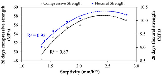 Relationship between the sorptivity value, and the 28 days compressive and flexural strength.