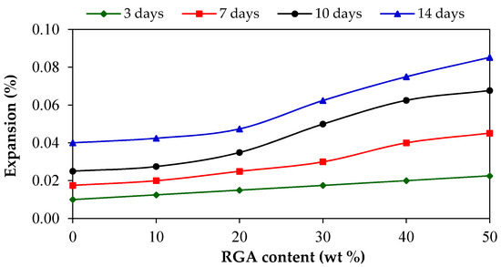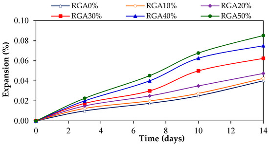 The mechanism of ASR is the chemical process between siliceous aggregate and hydroxyl ion in hardened concrete that leads to evolution of viscous alkali–silicate gel [52]. The formation of alkali–silicate gel increases the volume of concrete i.e., exerts expansion pressure inside and causes potential cracks and disruption [4,28,31]. The accelerated mortar bar test results showed the expansion of specimens due to ASR measured at 3, 7, 10 and 14 days and are graphically given in Figure 20 and Figure 21. It was clearly noted that as the content of RGA increased, ASR expansion also increased. This result is in concurrence with other studies [18,24,48,53,54]. Although the ASR expansion in mortar bars incorporating RGA increased substantially with age, expansion of all specimens at 14 days were below 0.1%, which could be considered as innocuous according to ASTM C1260 [38]. Based on visual observations, specimens containing 40% and 50% RGA showed slight mapping micro-cracks on the surface after 14 days of curing in 1N NaOH solution, while all other specimens were sound.