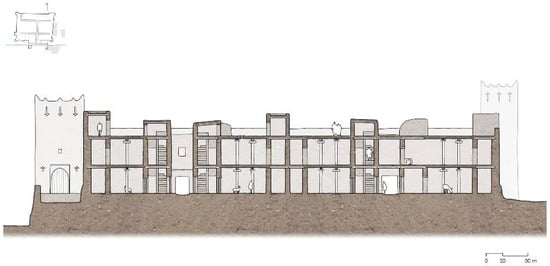 3]. The ‘kasbahs’ are usually integrated by a ground floor and two heights, which are surpassed by the towers’ upper floor, which have three stories. A typical ‘kasbah’ is organized as follows: after accessing its interior through a door that is placed in the middle of one of its cloths, we find a vestibule in whose axis the staircase is located, generating two spaces on both sides where different rooms for storage and stable are found. The first and second floors follow the same layout; around the central nucleus of the staircase, a corridor gives access to new rooms for family use up to the rooftop, from where the interior of the last section of the towers can be accessed. The use of the roof and the towers’ top floor is intended for drying food and the housing of domestic animals [