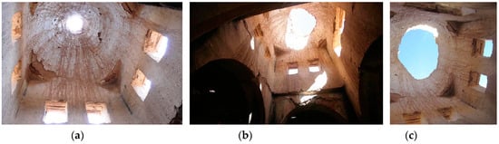 Figure 10). The vault had lost part of its surface, and it was rebuilt using the same original material and system, that is, by means of rowlock adobe bricks without formwork. Its surface was then covered with a straw and mud mixture. The walls presented large fissures resulting from runoff. These fissures were sewn with keys of palm wood and then covered with successive straw and mud pounding. In the slab, loose earth was removed and both the supports of the palm beams and the different gaps that had appeared were consolidated (