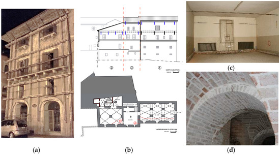 As an example, in the historic palace shown in Figure 3b–d, another example of excessive safety measures is reported: after the first shock in 2016, cracks formed mainly along one corner, where the southerly walls are not aligned (Figure 3b). Due to the emergency, an array of iron tie-rods were immediately inserted in the two upper floors of the whole building, with the aim to stop the overturning of the southern façade. Probably, having a correct geometrical survey during the first damage survey would have shown that, instead of having overturning problems, there were more hammering problems exactly in the damaged corner. The different walls’ thickness, pillar dimensions, and floor typology (clearly visible in the drawings), together with the crack’s location, could immediately have shown the transformation of the building over the time: two lateral box-shaped volumes and a third one, in between, closed in a second time. Thus, the weak point is exactly this last added volume and, as a consequence, the provisional intervention should have mainly improved this weakness from the top to the base, instead of being spread through the building, reducing the number of tie rods. It must be then reported that this realized provisional intervention was not able to prevent the formation of fresh new cracks, after further shocks, localized around the same corner, but in the basement vaults (Figure 3b,d), where tie rods maybe should have been added before. The complex geometry of the building with its historical evolution, together with recent provisional safety measures, contributed to make the building more vulnerable and now with many rooms obstructed in their use [17].