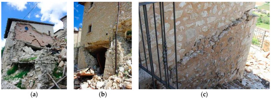 Similar unexpected damage was also observed when a total reconstruction of the damaged upper floors was carried out (with clay block masonry inside and stone veneer outside), while the ground floor was repaired and the masonry walls strengthened, preserving the original barrel vault internally. Ignoring the adopted technique used to connect old and new masonry parts, it resulted in different patterns of behaviour: for example, where no cracks were evident or the external stone veneer did not collapse (as in Figure 5a), the upper portion translated and rotated over the weaker ground floor, causing serious partial collapse (Figure 5b,c).