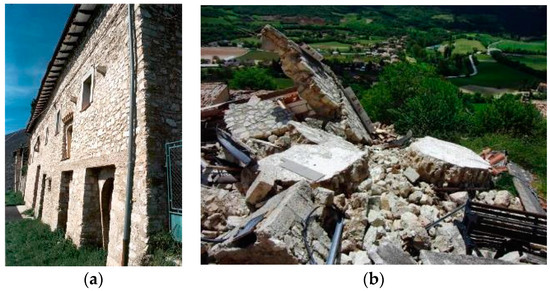 Finally, the most unexpected behaviour was shown by buildings subjected to global structural retrofitting (upgrading intervention), carried out during the 1970s–1980s with the aim to reach, or improve, the original structural performance (with a mix of different materials, such as RC structures in substitution of wooden flooring and roofs, cement-based grout injection, masonry jacketing, new stone masonry veneer application, overlapping with tuff masonry walls, etc.). Those buildings, due to the previous shocks in 1997, which caused no evident damage, and a supposed lack of subsequent maintenance, collapsed completely during the 2016 main event (Figure 6), highlighting the vulnerability caused by a loss of constructive homogeneity, despite the simple and regular shape of the building [21].