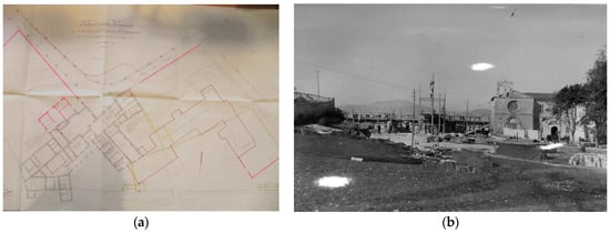 The expansion project of 1931: (a) The general plan of the first project/design hypothesis (Cfr. ASA, Comune Aq, cat. X, cl. II (1906–1940): Lavori al civico Ospedale di San Salvatore. Drawings highlighting the “old structures” and the new hospital plan with an explanatory report, 25 April 1931, Eng. R. Inverardi); (b) The construction yard.